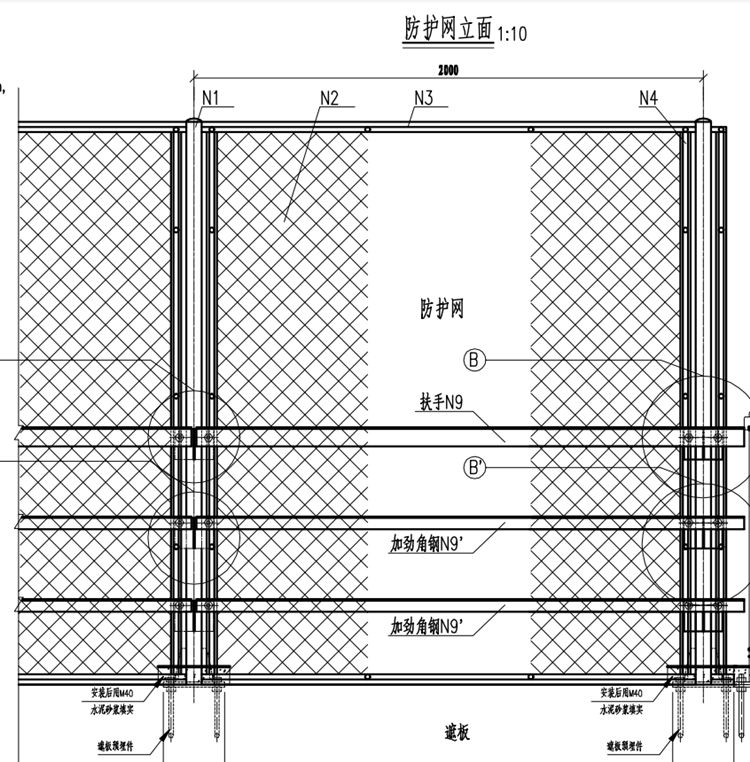 25cm。网立柱的间距不恰为2m间隔时,可根据现场情况适当调整钢筋网及N3的尺寸。