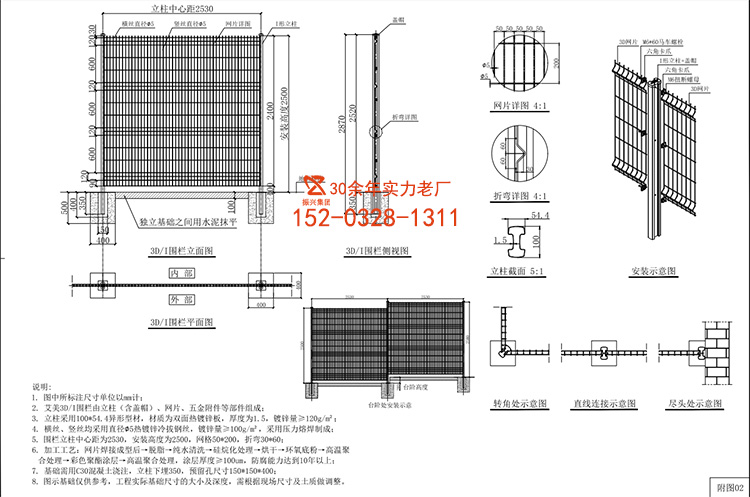 5.围栏立柱中心距为2530,安装高度为2500,网格50*200,折弯30*60: