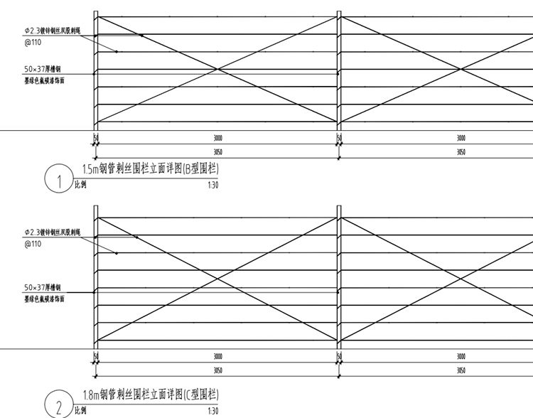 5.1.5m钢管双股刺绳围栏样式根据定制厂家实际生产情况,需专业厂家二次深化设计、制作并安装,样式经过业主及设计方同意后可做调整。