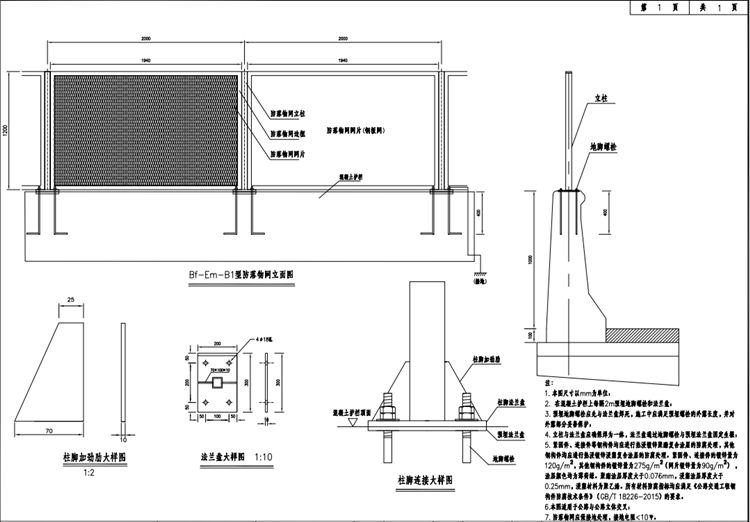 60mm,跨公路的防落物网网片高1.2m。网片焊接于角钢边框上。除紧固件、地脚螺栓、预埋法兰盘采用热浸镀锌处理外,其它构件均应进行涂塑处理,涂塑层颜色采用薄荷绿;防腐符合《公路交通工程钢构件防腐技术条件》GB/T18226-2015 的要求。
