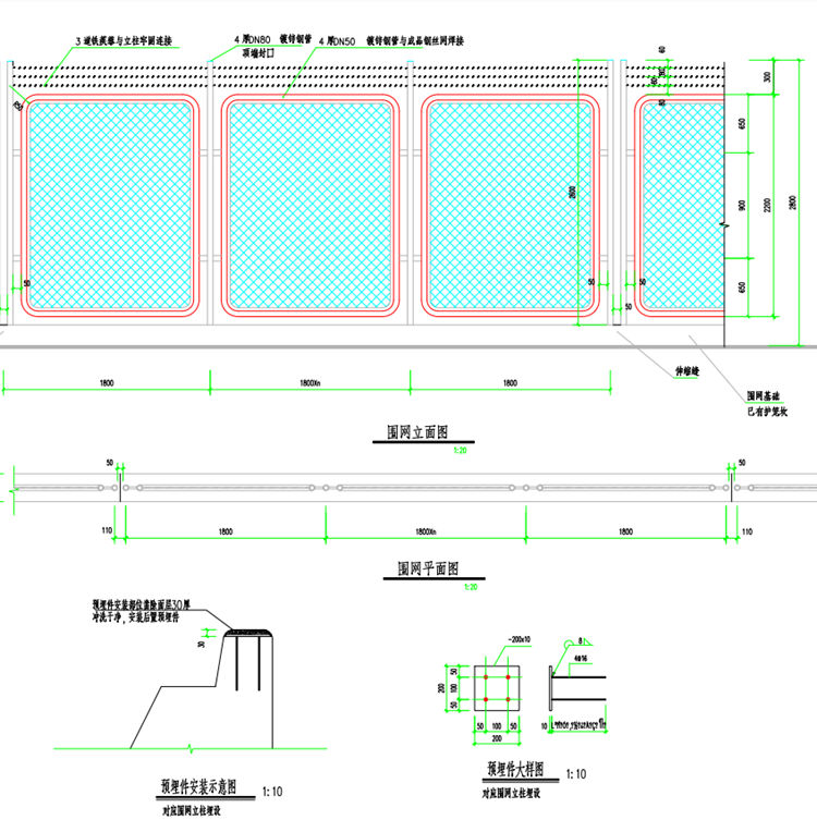 4、围网其他注意事项:图中尺寸单位在本设计说明及图纸中均以毫米计,标高以米计;图中未注明事宜均按现行建筑工程及验收技术规范进行施工;施工中应注意与各专业图纸配合并做好预埋件及预留孔洞。