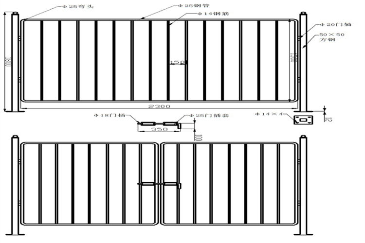 12、门式防护栏还需配有φ18门插,350mm×100mm,且门插轴与套公差不得大于0.2mm;供货时除φ20门轴的凸轴无需焊接外,其余需成品供货。