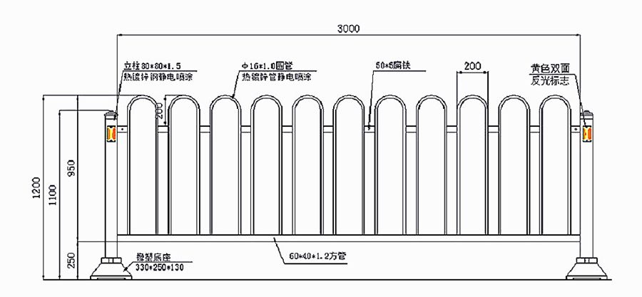 结构:市政交通护栏是由N个倒U形相互连接与两端立柱和底部横支撑连接组成,多用铸铁底座或预制浇注稳固。