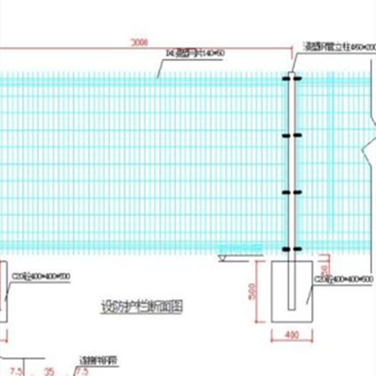 1、本图山区野生动物防护栏尺寸以毫米为单位,立柱与网片连接螺栓采用M8*25mm防盗螺栓,基础采用C20预制混凝土(规格为400*400*500mm)。