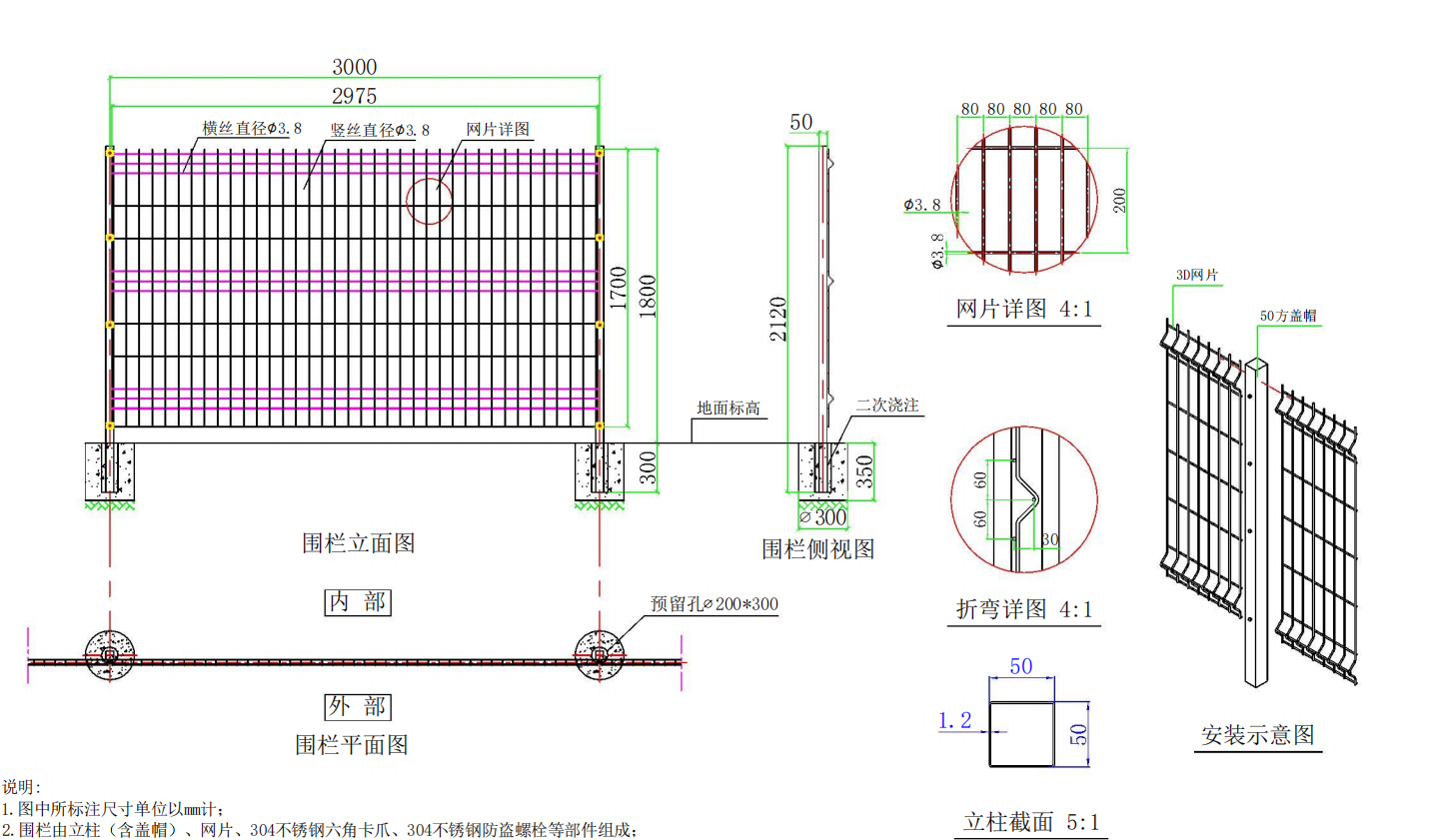 5.围栏立柱中心距为3000,安装高度为1800,网格80*200,折弯30*60;