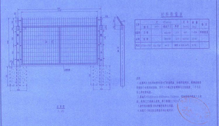 金属网片采用Q235矩管边框,规格30mm*50mm,矩管厚度2.0mm;内部网丝采用HPB300 ¢4.0mm高线冷拔钢丝,规格75mm*150mm。